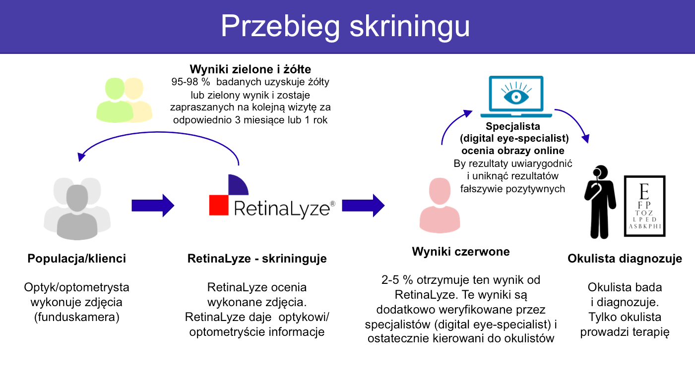 System RetinaLyze nie wymaga obsługi specjalisty. Operatorem może być optometrysta lub pracownik salonu optycznego czy gabinetu okulistycznego, który przygotowuje pacjentów do dalszych badań. Osoby z odpowiednim wynikiem, kierowane są do konsultacji okulistycznych.