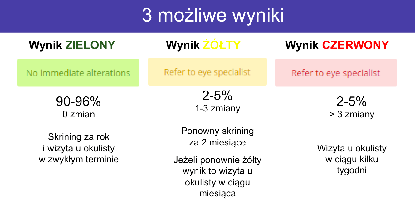 Na podstawie setek tysięcy przesiewów już zrealizowanych, można założyć, iż 97% przypadków pacjentów, dowiaduje się, iż ma wynik “zielony”, czyli nie wymagający żadnych konsultacji lekarskich. Co oznacza, że dzięki systemowi RetinaLyze niezwykle szybko i tanio docieramy do tych 3% osób, które wymagają opieki lekarskiej bez żadnej zwłoki, dzięki czemu mogą nie tylko uratować wzrok, ale wpaść na trop wielu innych, nieuświadomionych jednostek chorobowych.