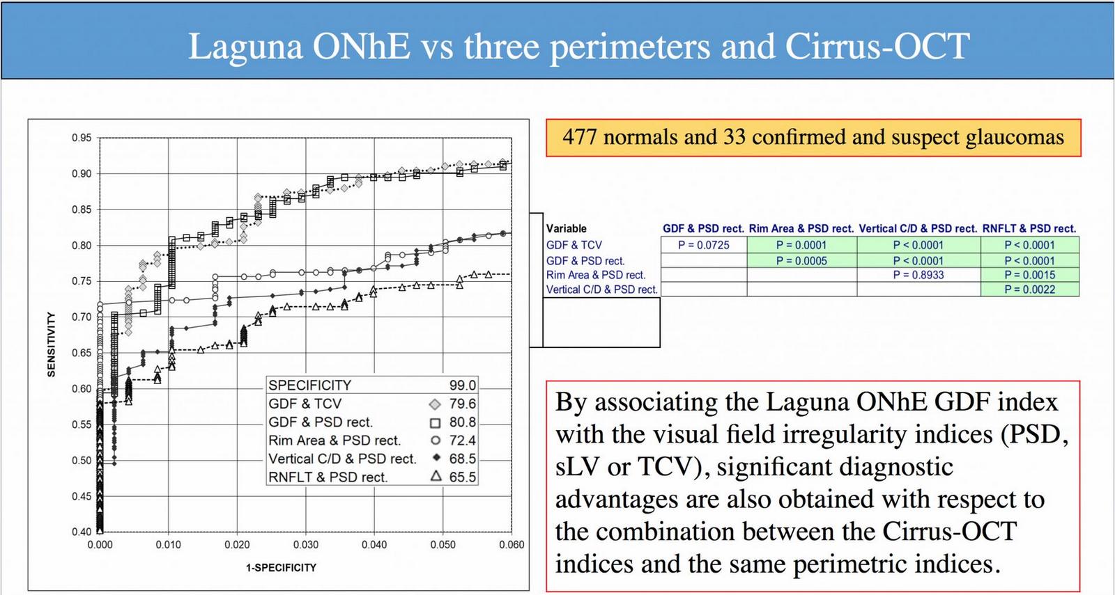 W drugim z wykładów przeanalizowane zostały wyniki uzyskane przez powiązanie indeksu Laguna ONhE GDF oraz OCT z wskaźnikami perymetrycznymi, zwłaszcza te analizujące nieprawidłowości pola widzenia. Wśród nich są PSD obwodów Humphrey i Oculus i ich odpowiednik (sLV) w obwodzie Octopus oraz nowy wskaźnik nieprawidłowości, który został opatentowany i nazwany Thresholds Coefficient of Variation (TCV), który bada harmonię i symetrię 18-punktowego centralnego pola widzenia. Uzyskane wyniki wskazują, że w tym przypadku powiązanie metody Laguna ONhE z perymetrią zapewnia znacznie lepsze wyniki w odniesieniu do dowolnych skojarzeń między indeksami OCT i perymetrią, z wysoką istotnością statystyczną.