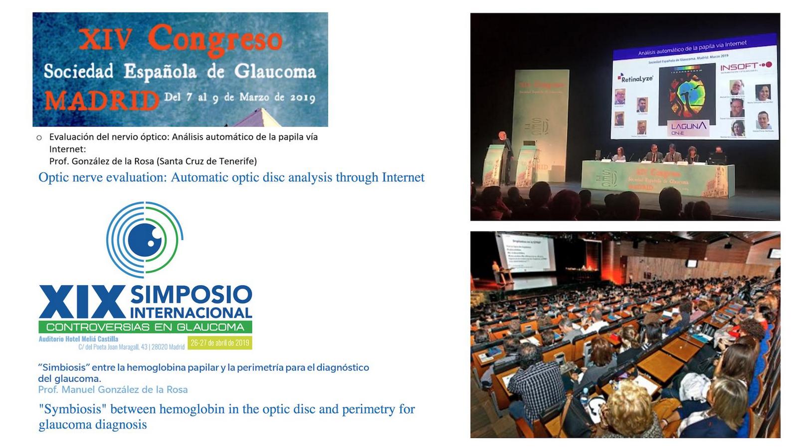 Wielokrotny wynalazca, profesor Gonzalez de la Rosa został poproszony o wystąpienie podczas dwóch wydarzeń w Madrycie, w marcu i kwietniu 2019 roku. Pierwszym z nich był coroczny kongres Spanish Glaucoma Society, podczas którego przedstawił on ogólny zarys projektu oraz wyniki programu Laguna ONhE (Laguna Optic Nerve Head) do analizy perfuzji[1] tarczy nerwu wzrokowego poprzez zautomatyzowaną analizę kolorowych fotografii. Algorytm wykonujący tę analizę został stworzony przez firmę INSOFT S.L pod kierunkiem profesora GR i wprowadzony na rynek przez duńską firmę Retinalyze.